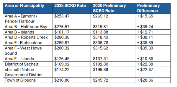 For example: If your home is worth $800,000 and the preliminary 2026 SCRD tax rate is $200 then the SCRD portion of your tax bill would be 8 x $200 = $1600.