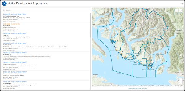 The SCRD Planning and Development Department publishes information on active development applications within the Electoral Areas, including development permits, subdivision reviews, and tree cutting permits.